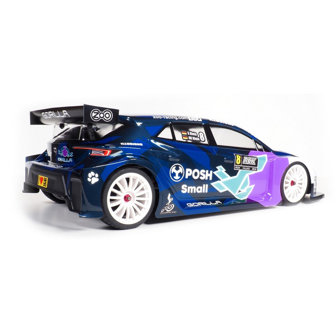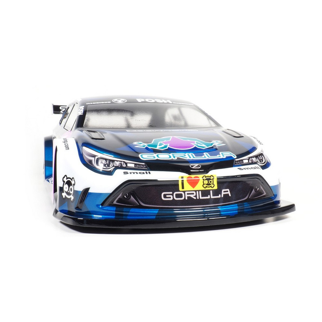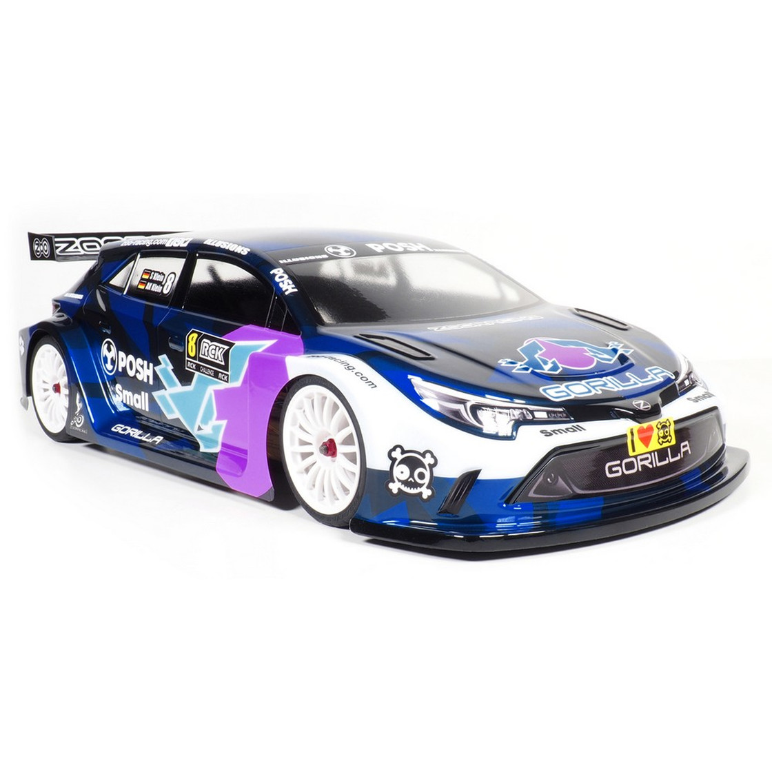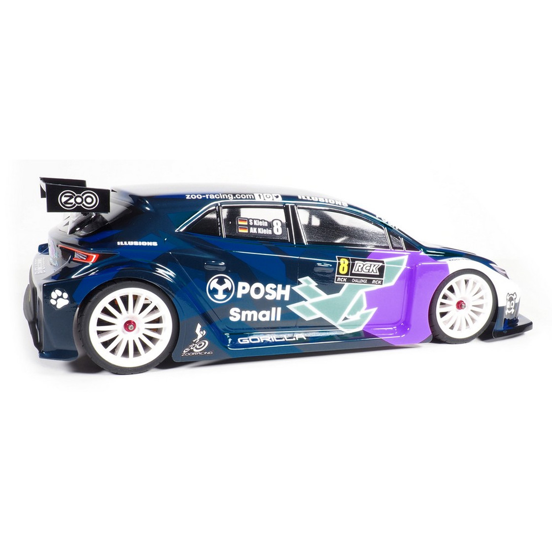 The Gorilla body shell for 190mm FWD touring cars is ZooRacing‘s latest 1/10th scale on-road body shell and our idea of a high-performance front-wheel drive body shell for this ever growing and very fun class. The goal was to create a stylish yet efficient body with advanced aerodynamics, while still offering a somewhat scale look that takes design cues from a famous Japanese hatchback car and meets with current FWD touring car body shell regulations. The Gorilla features a futuristic, compact design with a low roof line, wide wheel arches and a huge front splitter, all of which add to very balanced downforce, which is further helped by a large rear wing and integrated roof spoiler.