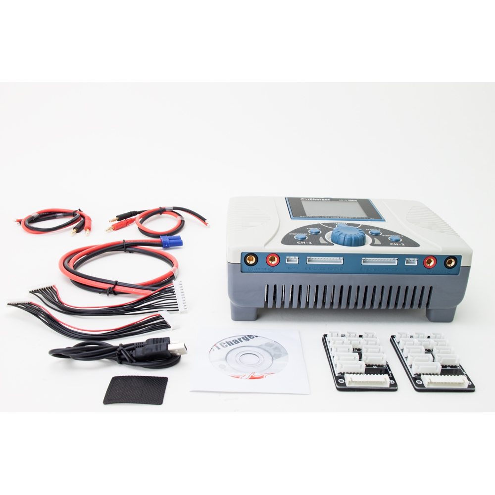 Lieferumfang: Mini CD, EC5 Kabel zum selbst konfektionieren (Gegenstück Anschluss Ladegerät), 2x Junsi 11-11 Balancerkabel, 2x Junsi CB-1010XH Balancerboards, USB Kabel