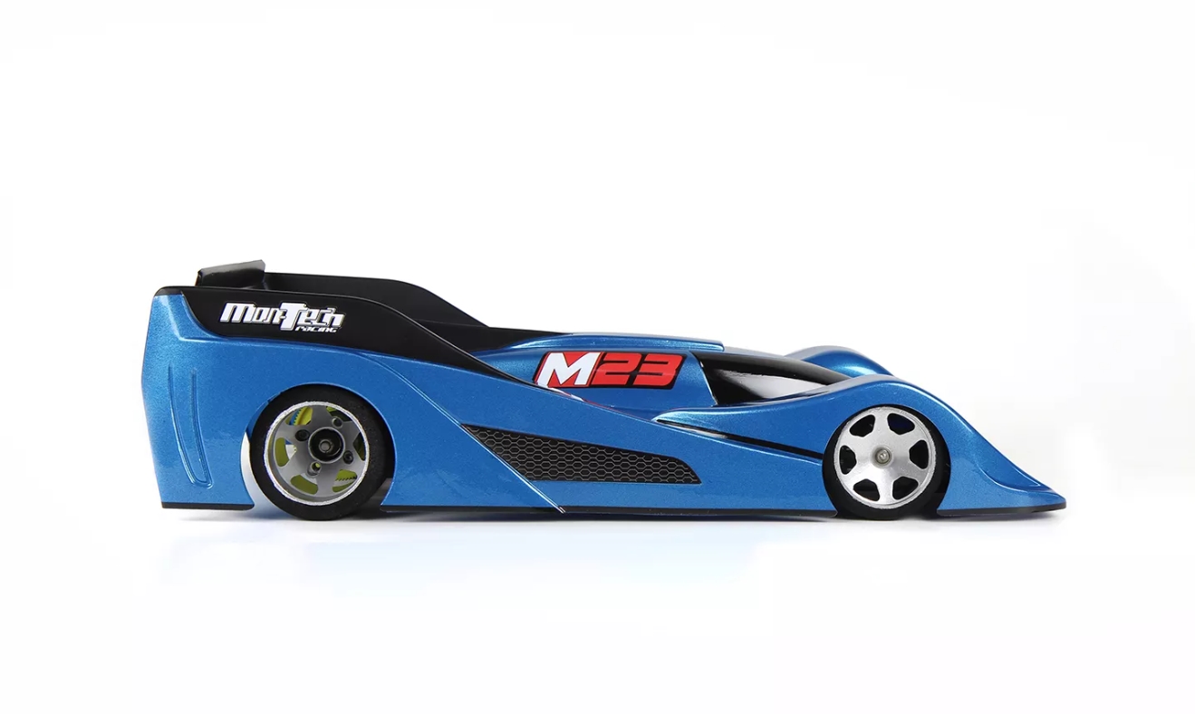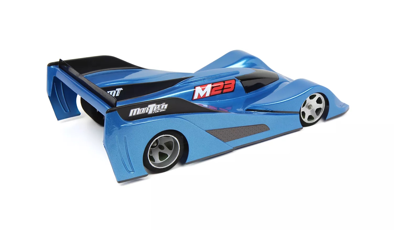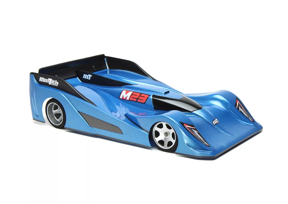 Die Mon-Tech M23 Karosserie für 235mm Pan Cars hat eine aggressive und scharfe Linienführung, die ihr eine hervorragende Stabilität und ein perfektes Kurvenverhalten mit viel Traktion in den Kurven verleiht.