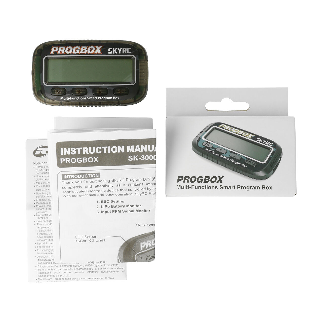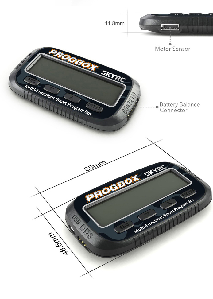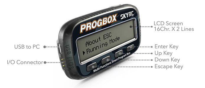 Die SkyRC Program Box ist eine sehr anspruchsvolles und hochwertiges elektronisches Gerät welches über einen Hochleistungs-Mikroprozessor verfügt. Er besitzt eine sehr kompakte Bauweise und bietet dennoch zahlreiche Funktionen wie z.B. diese sechs um Geräte zu programmieren, zu verbinden oder zu überprüfen.