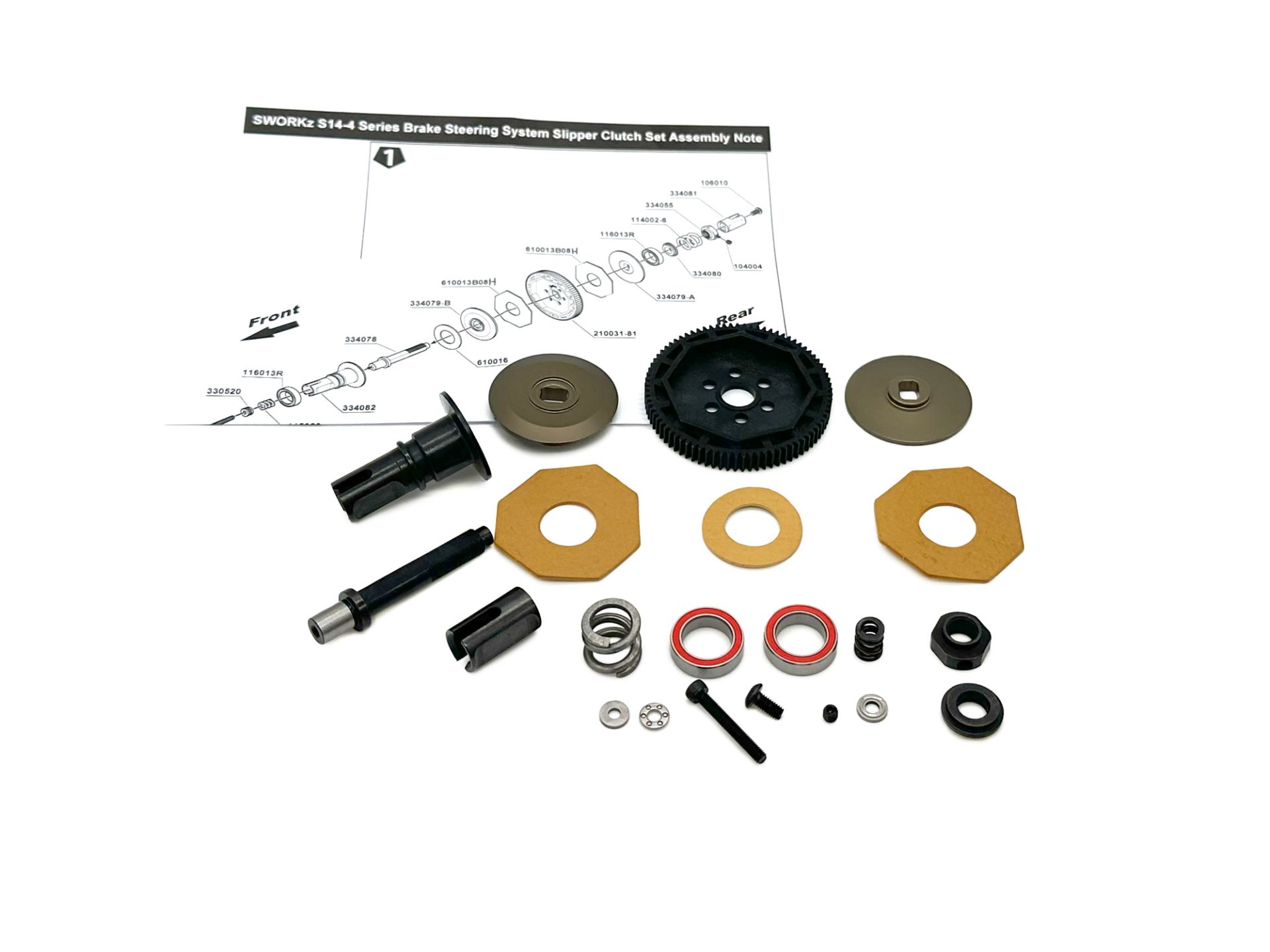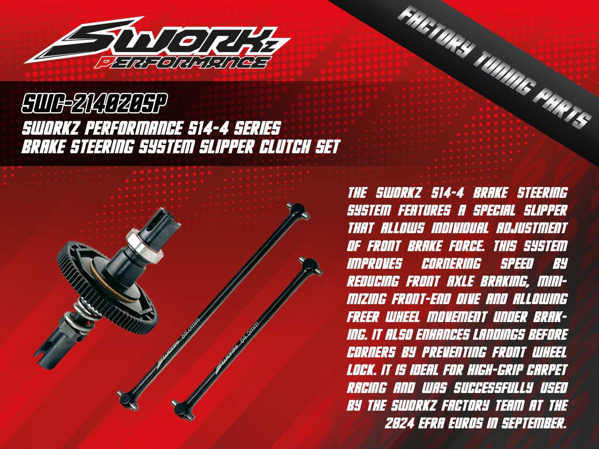 Das SWORKz S14-4 Brake Steering System ist ein spezieller Slipper, der eine individuelle Einstellung der Vorderradbremskraft ermöglicht. Dieser Slipper verbessert die Kurvengeschwindigkeit, indem die Bremskraft an der Vorderachse reduziert werden kann. Dadurch wird das Eintauchen der Vorderachse minimiert, da die Vorderräder freier laufen beim Bremsen. Zusätzlich wird das Landen vor Kurven verbessert, indem die Vorderachse beim Bremsen weniger blockiert. Das S14-4 Brake Steering System ist ideal für Teppichrennen mit hohem Grip und wurde vom SWORKz Factory Team bereits bei den EFRA Euros 2024 im September erfolgreich eingesetzt.
