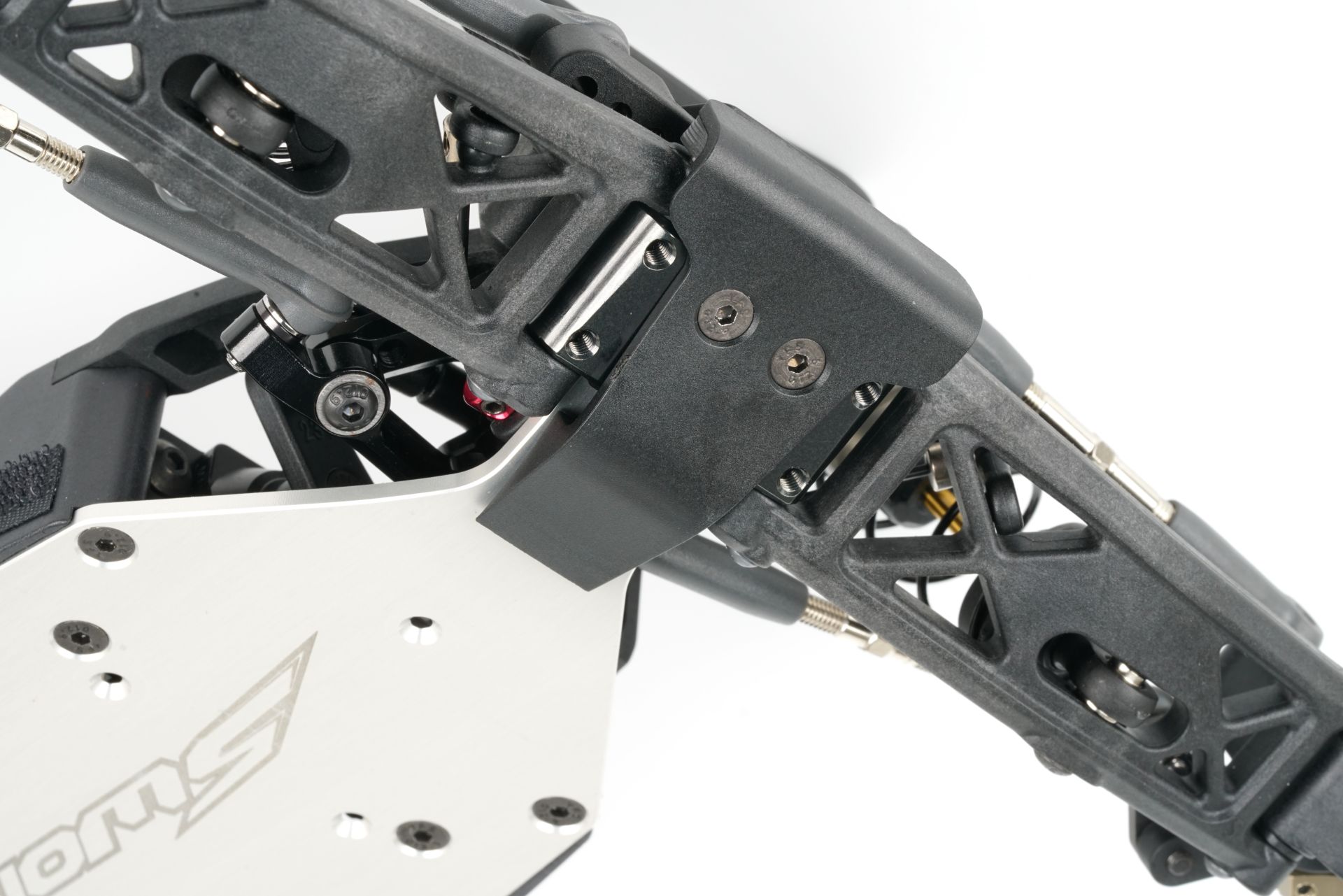 Abgewinkelte untere Querlenker senken die Dämpferaufnahmeposition, reduzieren den Schwerpunkt und verbessern die Stabilität. Das Getriebe wurde für eine ideale Gewichtsverteilung optimiert, wobei Größe und Festigkeit ausbalanciert wurden. Die Höhe der hinteren Radträger kann mit dem innovativen Synthesis Rear Hub System und modularen hinteren CVDs angepasst werden. Ein neu entwickeltes vorderes und hinteres Stabilisatorhalterungssystem ist enthalten, um die Kurvenkontrolle zu verbessern.