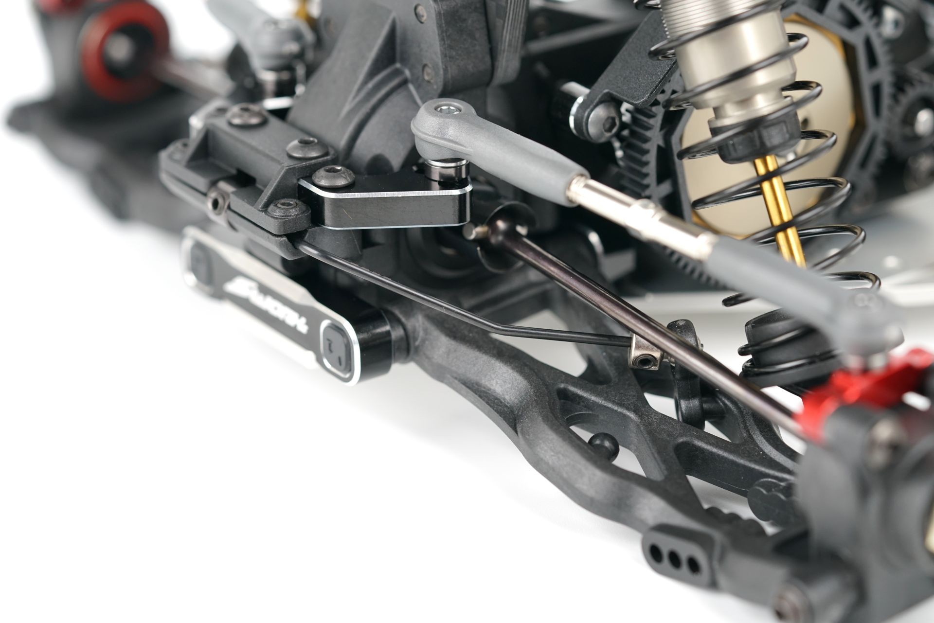 Ein neues 5,5mm Kugelbolzensystem und ein robustes 3,5mm Spurstangensystem verbessern die Lenkpräzision und die Gesamtstabilität. Die vollständig aus Aluminium gefertigten, einstellbaren Ackermann- und Lenkplatten bieten feinfühlige und sanfte Kontrolle bei hohem Grip.
