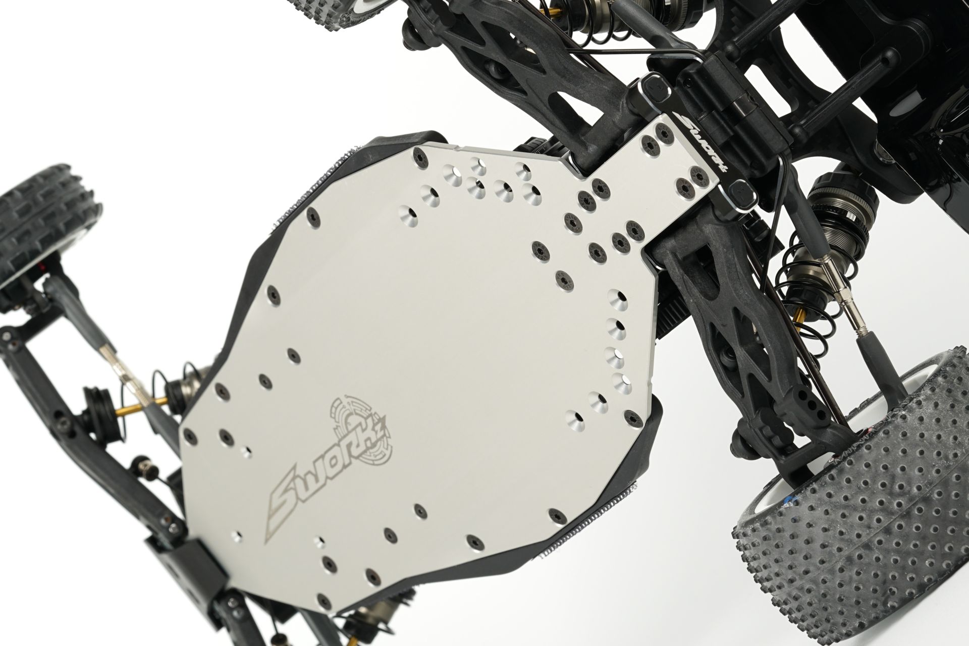 Das schnell wechselbare Getriebedifferentialsystem kann in vier verschiedenen Positionen montiert werden und bietet Flexibilität für verschiedene Streckeneinstellungen. Die 2-Pad Slipper-Kupplung verfügt über hart eloxierte Platten, hitzebeständige Pads und einen Zahnradschutz mit eingraviertem SWORKz-Logo.